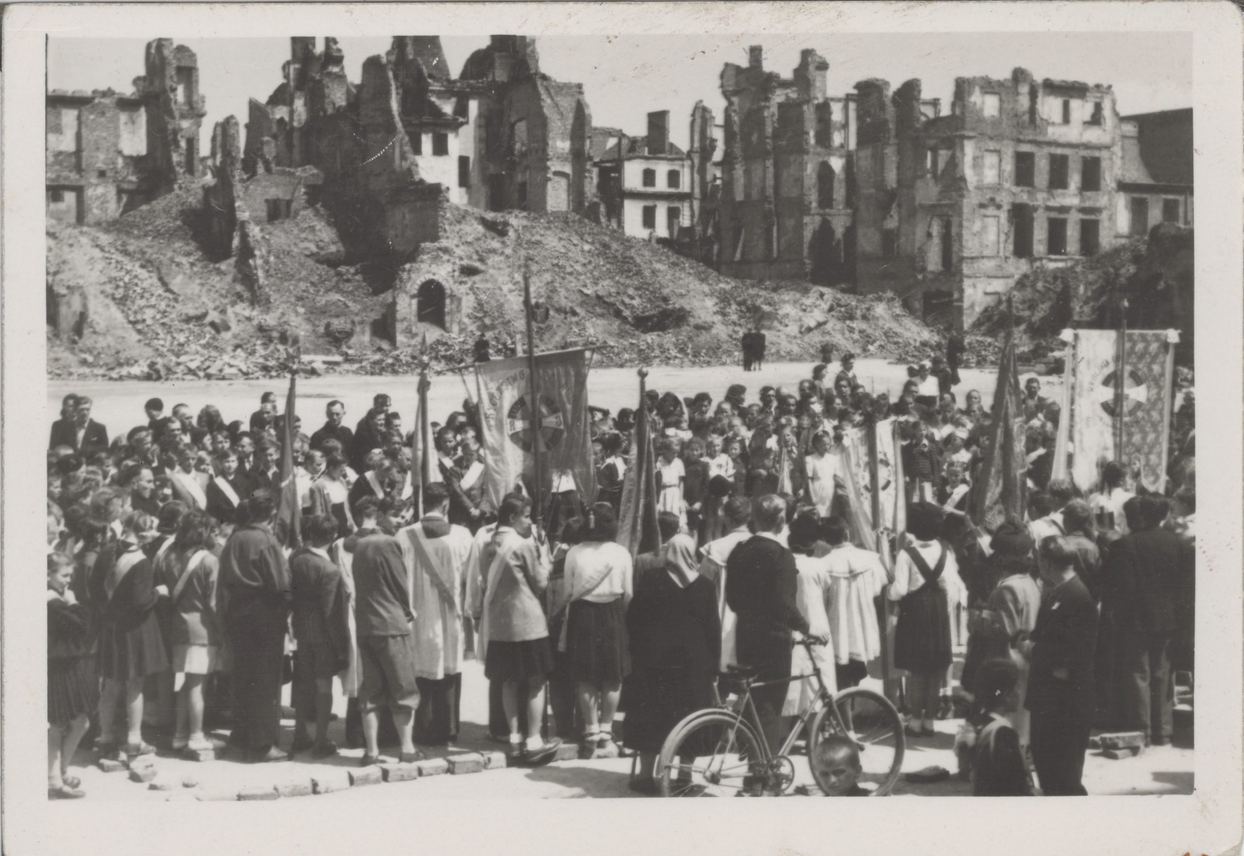 We wspomnianej wyżej jednostce znajduje się kilkanaście fotografii wykonanych podczas procesji Bożego Ciała dnia 23 maja 1948 roku. Największe wrażenie wywołuje zdjęcie, które skłoniło nas do napisania tego artykułu. W górnej części widzimy na nim miasto zniszczone, miasto w gruzach, miasto zgliszczy. Odcina się ono mocną białą linią placu Zamkowego od tłumu osób uczestniczących w procesji Bożego Ciała. Fotograf celowo lub całkiem przypadkowo uchwycił tą dwoistość życia w zniszczonej Warszawie. Z jednej strony cierpienie, zniszczenie i zgliszcza, a z drugiej radość dnia świątecznego, żarliwość celebracji religijnej. Tam śmierć, a tu nowe życie.