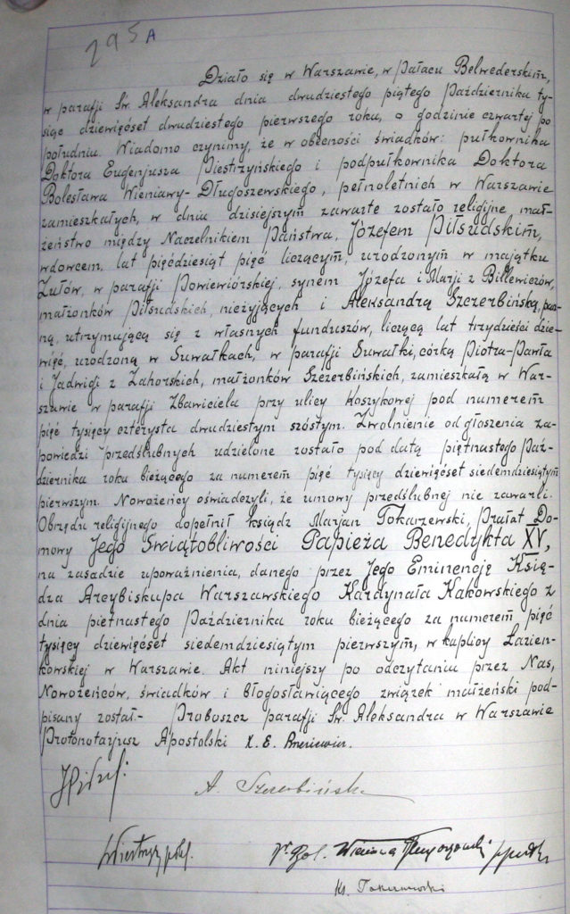 W akcie przeczytamy, że małżeństwo zostało zawarte w obecności świadków pułkownika Eugeniusza Piestrzyńskiego, osobistego lekarza Józefa Piłsudskiego oraz podpułkownika Bolesława Wieniawy-Długoszewksiego. Obrzędu dopełnił ks. Marian Tokarzewski na zasadzie upoważnienia danego przez arcybiskupa Aleksandra Kakowskiego. Cały dokument można przeczytać online: https://metryki.genealodzy.pl/metryka.php?ar=8&zs=9214d&sy=337&kt=1&plik=588-589.JPG#zoom=1&x=75&y=1394